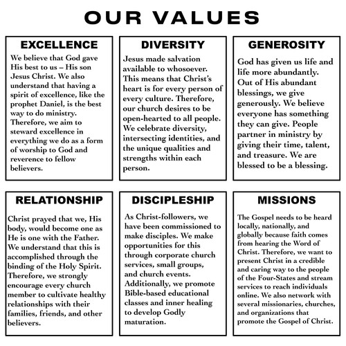 Every Christian is called into the ministry of reconciliation, such as ministering salvation, discipleship, and baptism to others. We also believe that God has called and appointed leaders to facilitate His Kingdom’s ministry such as Apostles, Prophets, Evangelists, Pastors, and Teachers. The purpose of these leaders is for the equipping of the body of Christ.